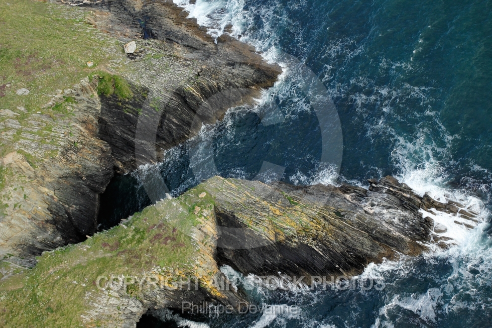 Description: Photo aérienne des falaises et grottes de Ty Mark, commune de Plomodiern 29550, Pors ar Varg, situé à 1km à l ouest des falaises de Kervigen et au sud de la Pointe de Tal Ar Grip et des plages de Pentrez-Lestrevet, département du Finistère 29, La Bretagne vue du ciel, France Ouest, Europe. Juillet 2012