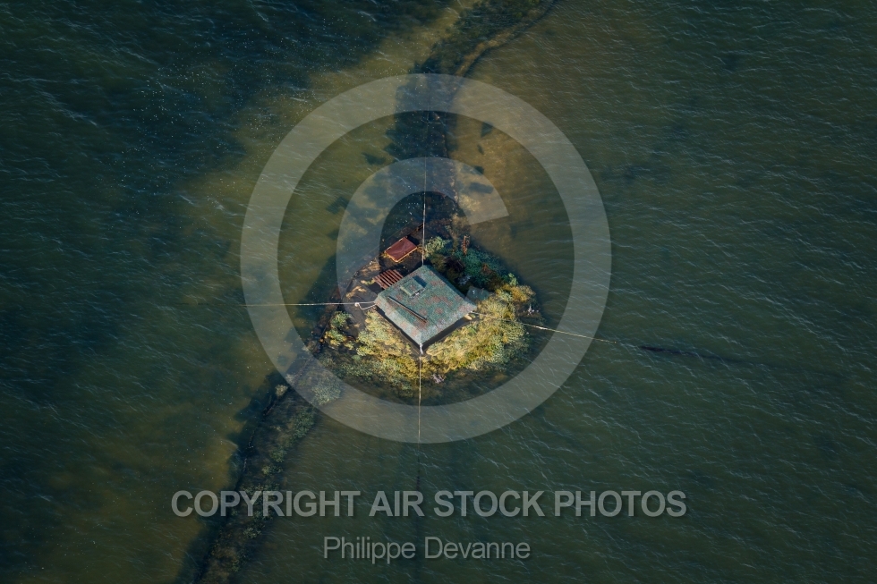 Photographie aérienne des tonnes ou cabanes pour de chasse dans les prés salés de la hume à Gujan-Mestra 33470, commune du Bassin d Arcahon, département de la Gironde, région Aquitaine, France - Juillet 2015