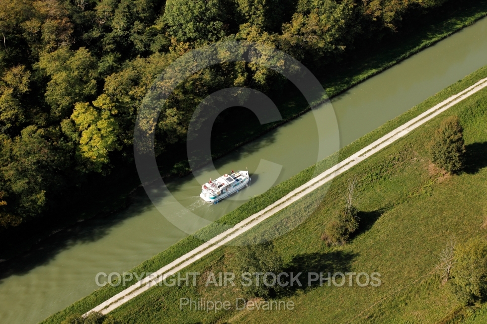 Photo aérienne d une péniche sur le canal latéral à la Loire au niveau de Beaulieu-sur-Loire 45630 département du Loiret région Centre France