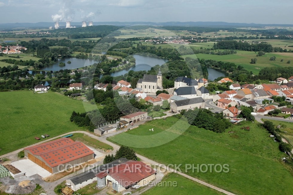Description: Photo aerienne de Berg-sur-Moselle 57570, centrale nucléaire de Cattenon en arriere plan, arrondissement de Thionville.la Moselle 57 vue du ciel en ULM paramoteur, en région Lorraine, France, Europe
