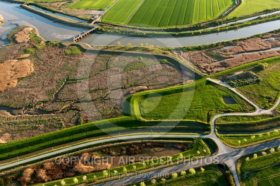 Photographie aérienne du Marais Poitevin en Vendée 85 situé sur les commune de Angles, Grues et St-Michel-en-l Herm en région Pays de la Loire Atlantique, France. Prise de vue avril 2017