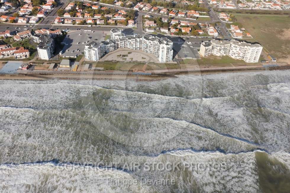 Description: Photographie aérienne de la houle et mer agitée à Saint-Gilles-Croix-de-Vie 85800, un jour de trés haute marée, situé à l ouest de la Vendée, en région Pays de la Loire, France. Prise de vue du 17 avril 2018