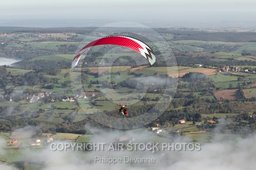 Description: Paramoteur en vol au dessus de la Brume . Vue du ciel en paramoteur au coeur du parc des volcans d Auvergne, département du Puys de Dôme 63 . Vol d automne octobre 2013 organisée en camping car à envrion 30 km de Clermont-Ferrand 63100