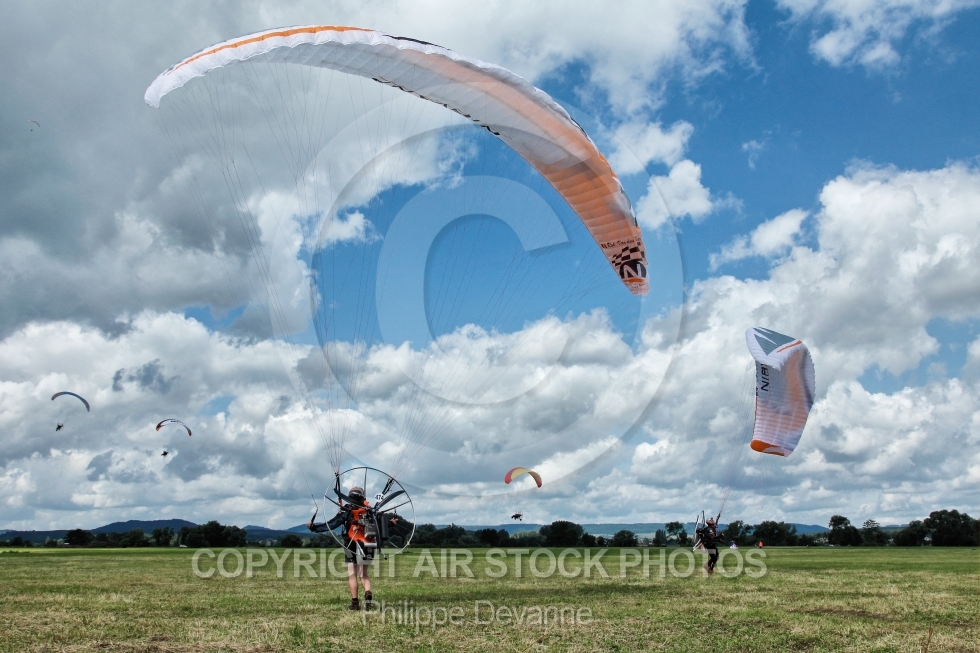 Description: Paramoteurs vus du sol au 7 eme mondial du paramoteur , le 22,23 et 24 juin 201 à57910 Basse-Ham, département de la Moselle, région Lorraine, France
