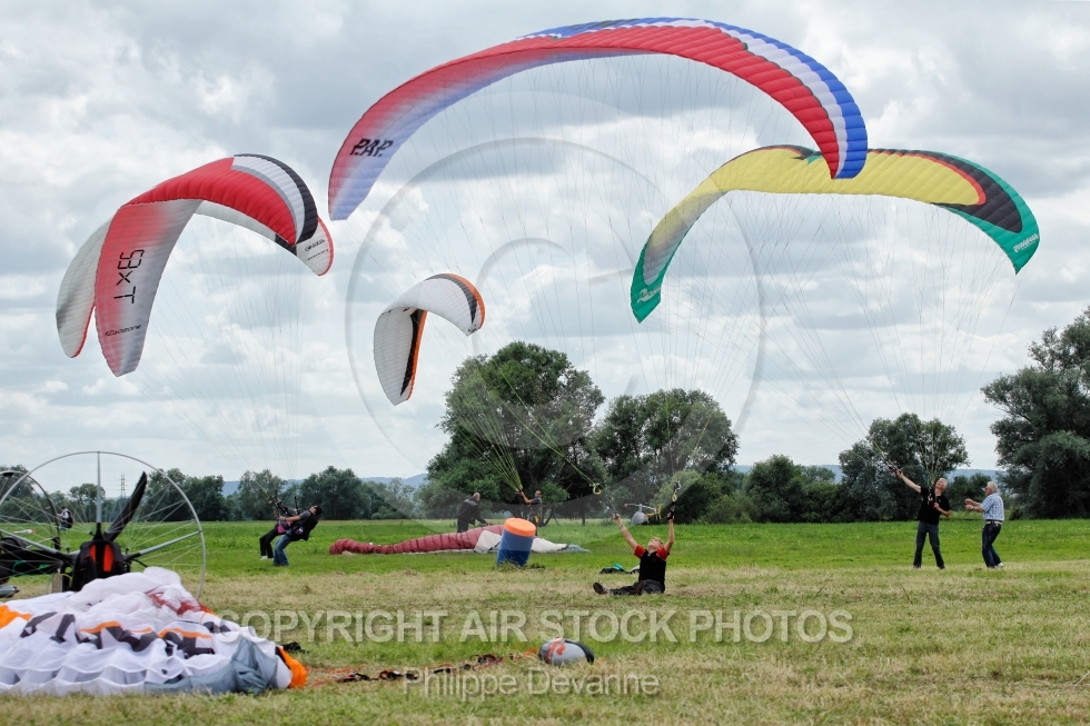 Description: Paramoteurs vus du sol au 7 eme mondial du paramoteur , le 22,23 et 24 juin 201 à57910 Basse-Ham, département de la Moselle, région Lorraine, France