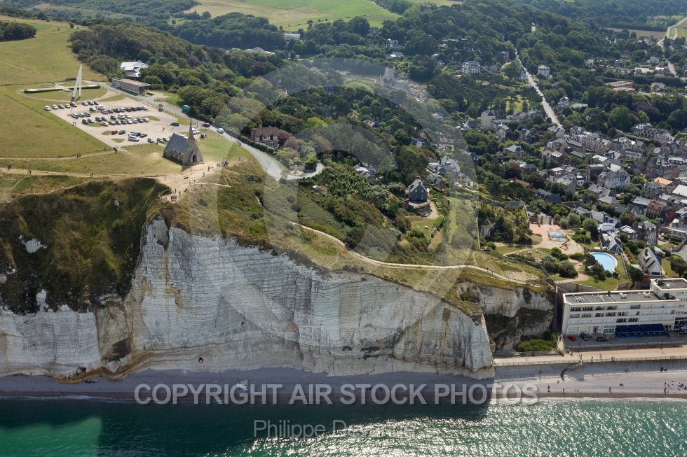 Photos aérienne de la falaise d Amont d Etretat 76790 sur la côte d Albatre , département de Seine-Maritime, région Haute normandie, France - Aout 2015