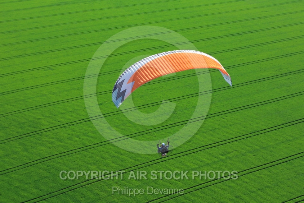 Description: parapente a moteur paramoteur dans un champ de blé vert au primtemps