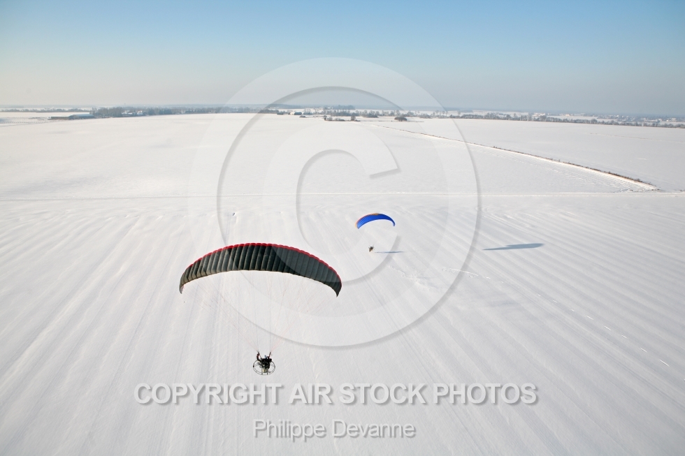 Paysage d hiver enneigé avec ciel bleu vu du ciel. Deux parapentes motorisés survolent les champs blancs